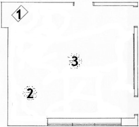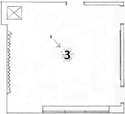 Here we have the talent (1) standing with their back to the upper left corner facing microphone position #3. On the wall to the right of the talent (your left) is our first acoustic treatment. It is foam acoustic material from Auralex. (The funny little bumps are my best artists rendering of the foam from overhead) Simply treating this wall and calling it a day would be far from adequate. There is a lot more work to do.