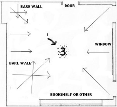 Position #2 is still a bad choice, just not as bad as the first. If you set up your microphone at position 2 and faced the corner (or stood with your back to it) you may be dealing with less reflective surfaces than position #1 but the three primary surfaces (both walls and the ceiling) all reflect directly back at the microphone and worse; the three reflections all meet right at the microphone at some point. It would take far too much time to try to correctly explain what happens to sound waves when they meet in a select area of the room and the microphone happens to be in the middle of that area, but it is safe to say all of the audio signals meet, intertwine, distort, reverse phase and null in these locations, accenting certain frequencies over others.