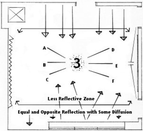 You may have noticed the treatment on the wall somewhat mirrors the outlined shape on the opposite wall, which in this plan is actually a window. It could be anything really. What I want you to notice here is this is going to be a reoccurring theme; when one wall is reflective, we want to make its opposite wall absorptive and diffusive, which we will cover as we go into this further.